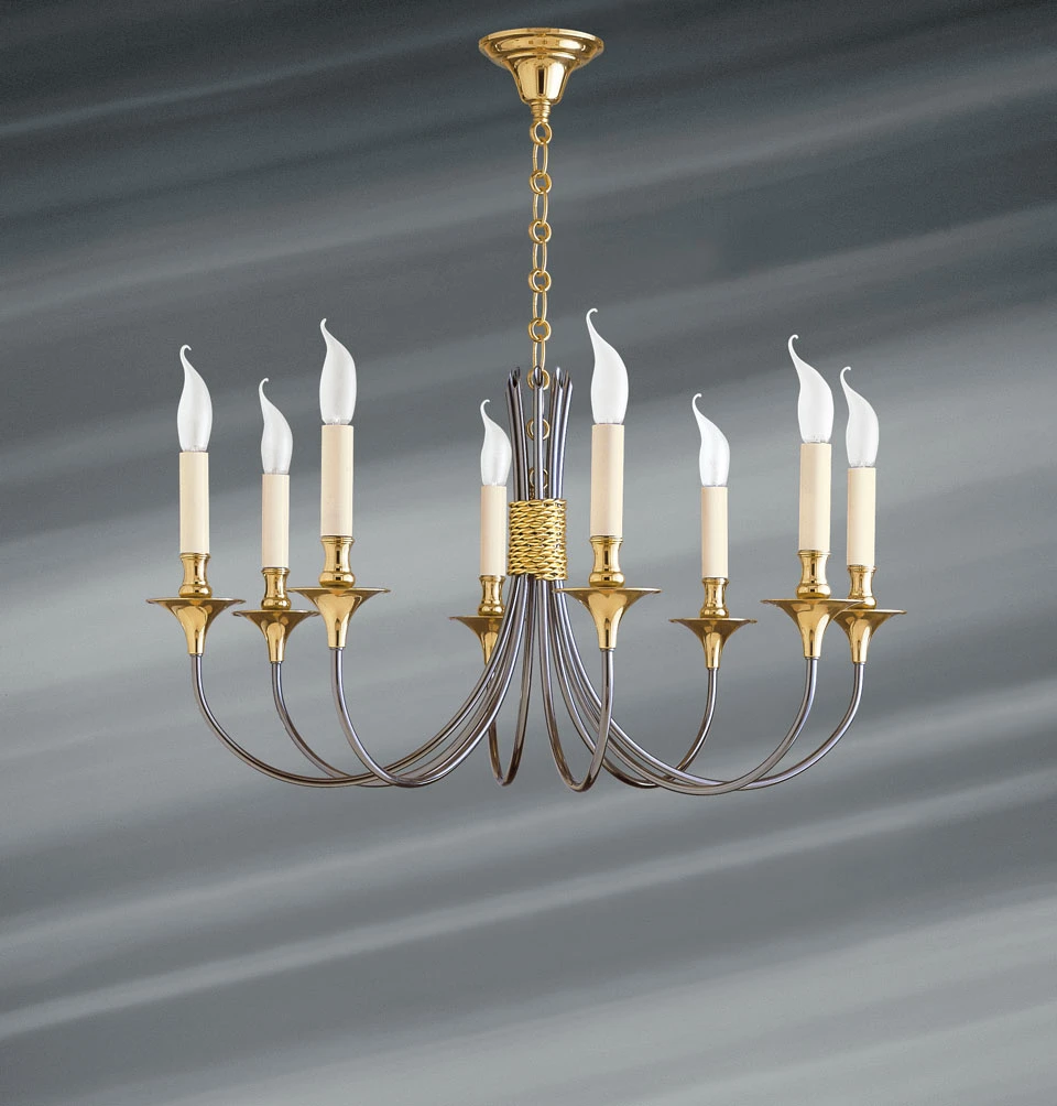 Un design classique épuré pour ce superbe lustre chandelier 8 lumières de la collection Liens, entièrement en métal finition or et canon de fusil. Le lustre est doté de 8 bras de métal noir en U qui sont attachés entre eux par un lien de métal doré comme un fagot, chaque bras est prolongé d’un bassin et d’une bobèche toutes deux en finition dorée, et surmonté d’un fourreau beige qui imite une bougie et complète le style chandelier du lustre. Le tout est suspendu par une chaîne dorée reliée à un cône de plafond en cloche décor or brillant. Ce modèle peut également être proposé en finition entièrement dorée, nous consulter pour cette option.