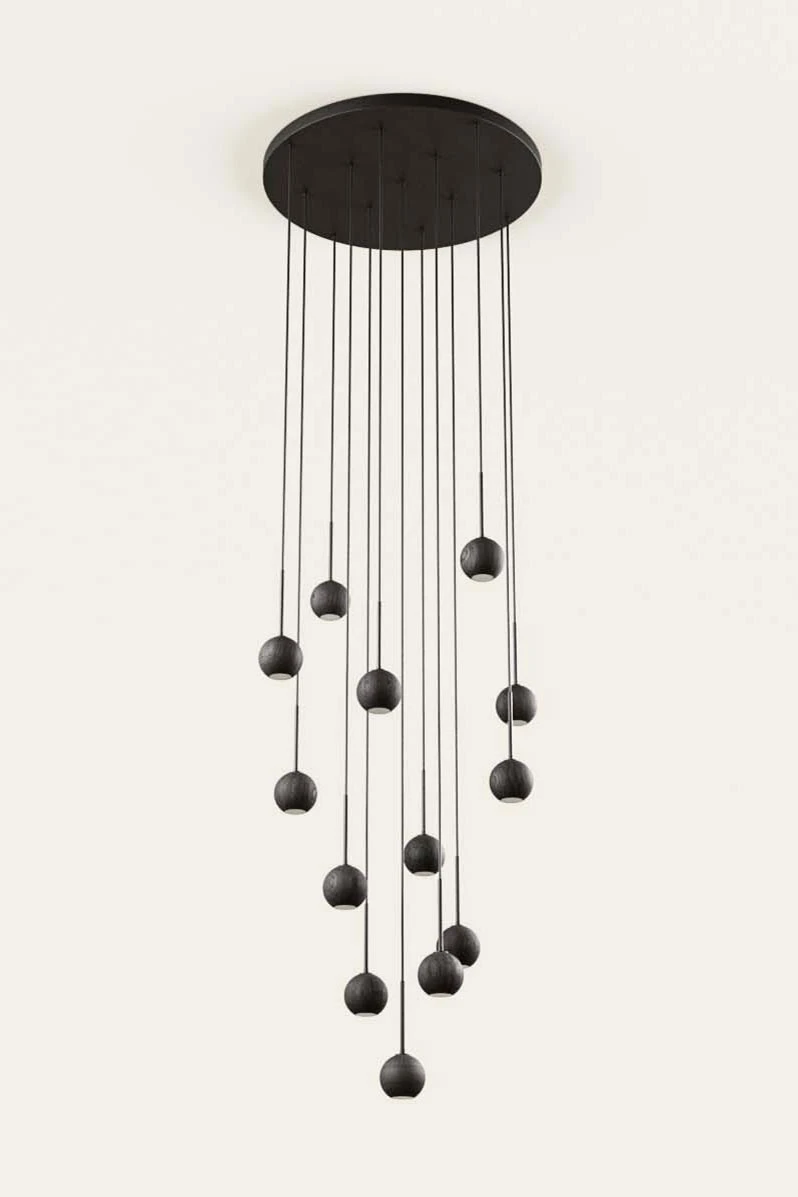Lita est un superbe lustre contemporain 13 lumières remarquable par son adaptabilité à tout environnement, il se compose de 13 petits diffuseurs en boule de bois de noisetier qui loge chacun un module LED intégré, le tout fixé sur un plateau rond métallique finition noir mat. Le bois garantit une lumière intense et chaleureuse. C’est depuis les années 1980 que la maison Aromas, dont les ateliers sont basés à Valence, manufacture ses collections de luminaires intemporels, avec comme élément central le travail du verre et du métal, agrémenté de techniques et matériaux traditionnels tels que la céramique, le bois ou le marbre. Nous consulter pour des lustre de 3 à 10 lumières.