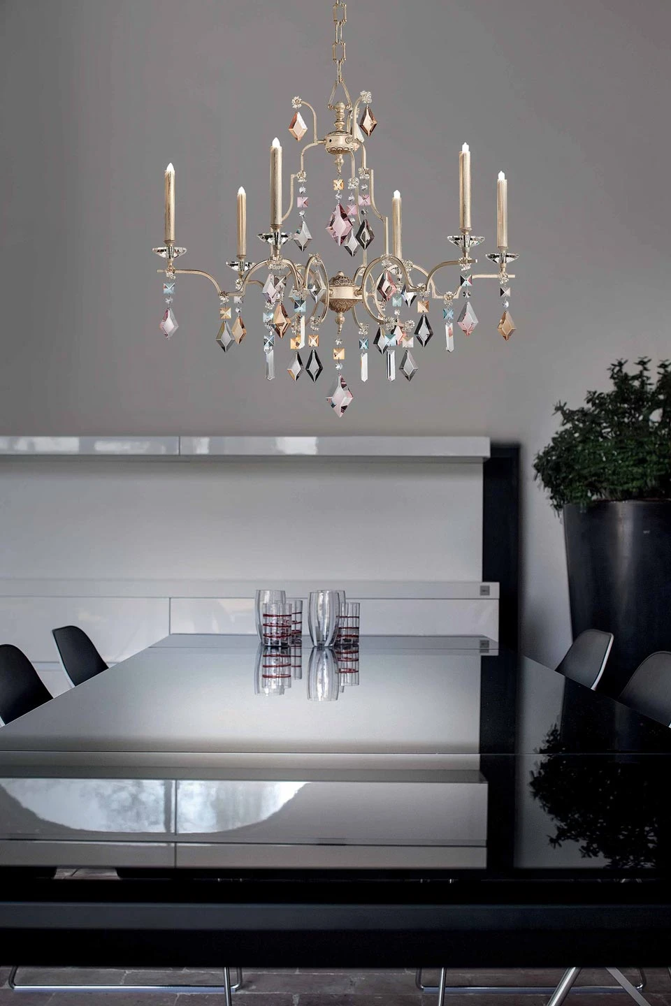 Un chic incomparable pour ce superbe lustre chandelier 6 lumières Lizzi fabriqué à la main, doté de magnifiques pampilles de cristal coloré et d’une structure métallique dorée. Le lustre est composé de six bras qui se déploient autour d’une petite sphère cintrée centrale, leur forme géométrique évoquent celle d’une clef, au bout de laquelle sont perché bassin en corolle de cristal et fourreau dorés qui imitent la forme d’une bougie. Le modèle est richement décoré de pampilles de cristal coloré bleues, orange, rose, noir, et suspendu au plafond grâce à une chaine. L’ensemble de la structure métallique est doté d’une finition dorée qui se marie à merveille avec les touches colorées des pampilles. La maison italienne Masiero réalise un parfait mariage entre l’esthétique vénitienne classique et la créativité permise par les innovations technologiques, pour une collection élégante et pléthorique.