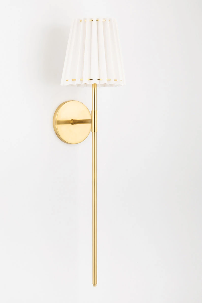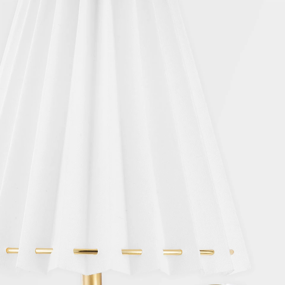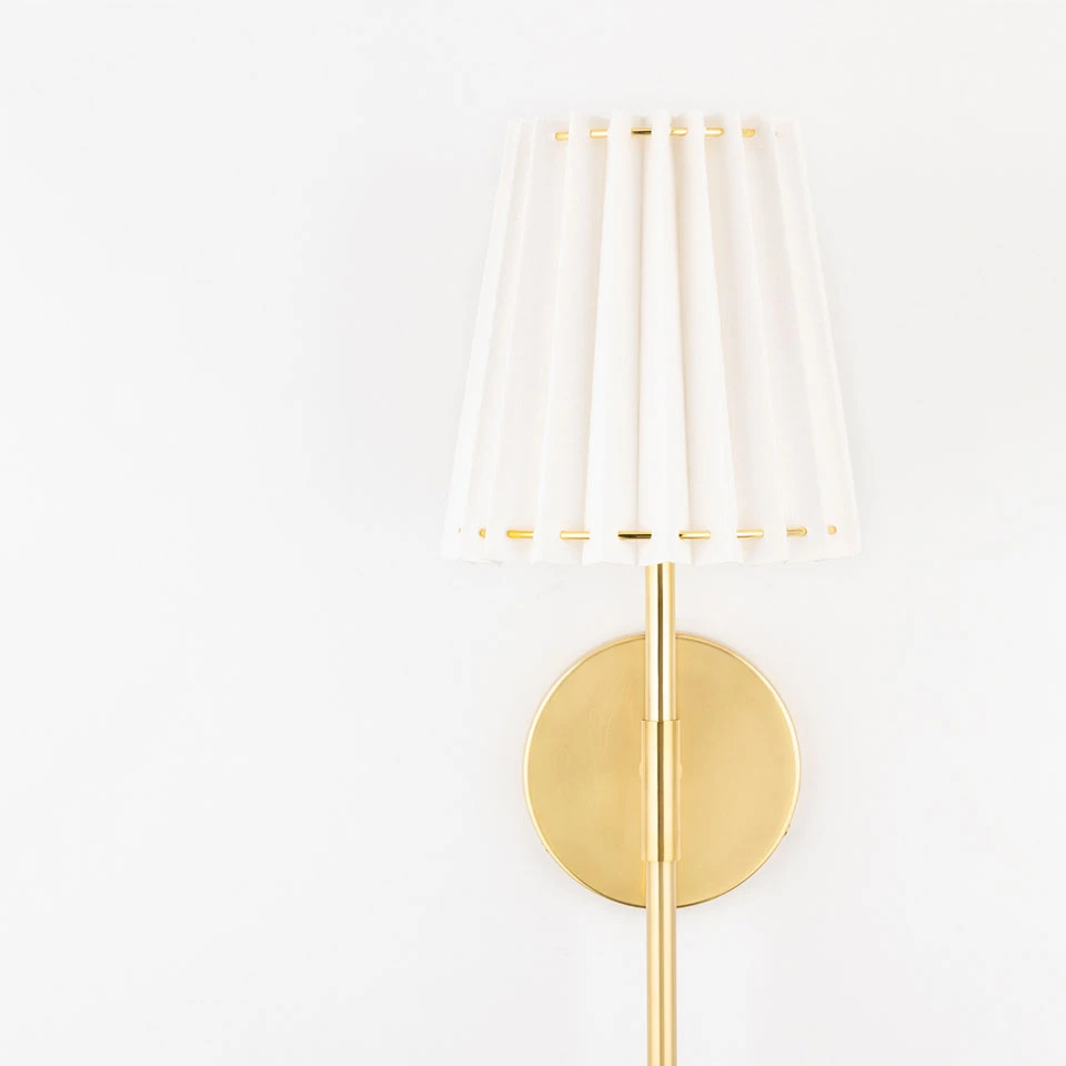 Laissez-vous séduire par la longue applique Demi qui remet le classique au gout du jour avec son abat-jour en lin plissé blanc et sa longue structure en métal doré. Le modèle est doté d’un support mural rond en métal doré, d’un bras composé d’un tronçon horizontal et d’une longue tige verticale en laiton doré et couronne d’un abat-jour légèrement conique en lin plissé blanc monté sur des anneaux de laiton doré qui apparaissent en pointillé à intervalle régulier. Demi est une applique versatile, qui se prête tant à des ambiances intimes comme à l’éclairage d’une bibliothèque par exemple, ou encadrant un buffet.