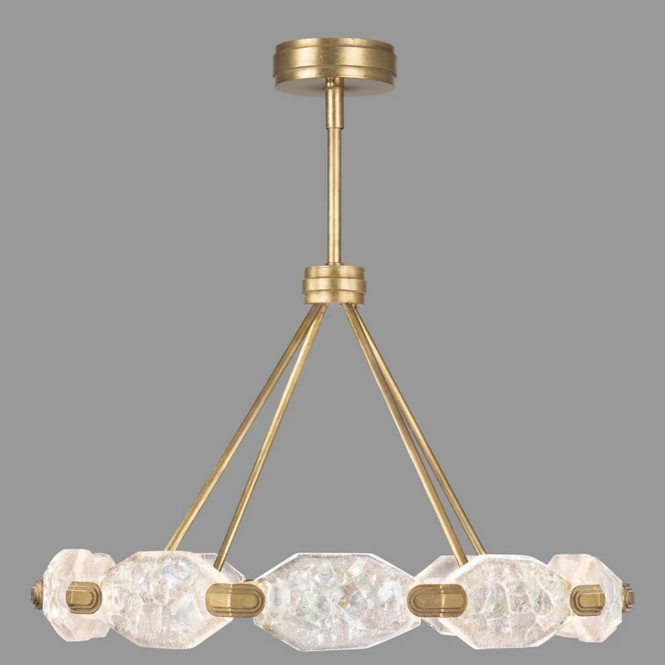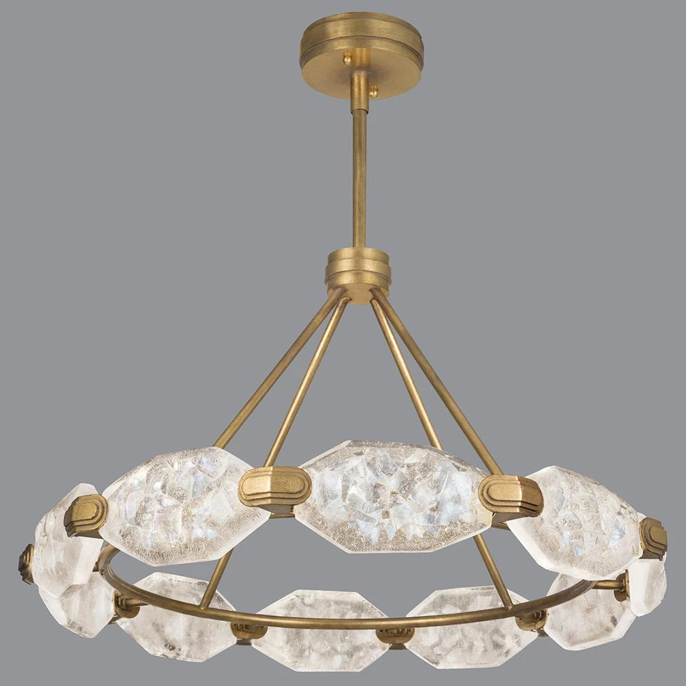 Imaginé par la designer Allison Paladino, ce superbe lustre se compose d’un structure circulaire en métal sur trois bras, la finition est à la feuille d’or, et sur cette structure sont disposés dix cristaux taillés en hexagone. La lumière est produite par une série de modules LED insérés dans le verre, et garantit un éclairage doux et agréable. Une collection toute de cristal, étincelante d’une lumière crépusculaire, pâle comme l’Arctique, qui ondule comme une aurore boréale. Le verre dichroïque, développé par la NASA, est fabriqué et taillé dans les ateliers de Fine Art Lamps en collaboration étroite avec le sculpteur de verre Frank Eglesby. La ligne allie finitions impeccables d’or, d’argent ou de bronze avec des cristaux hexagonaux qui s’intègrent chacun de maniée unique aux luminaires car taillés individuellement. La marque frappe une nouvelle fois par sa capacité à transformer la lumière en véritable œuvre d’art. La ligne comprend dix autres suspensions (16090028, 16090030, 16090037, 16090038, 16090039, 16090040, 16090041, 16090042, 16090049, 16090050, 16090051) et six appliques (16090031, 16090032, 16090033, 16090034, 16090035, 16090036).