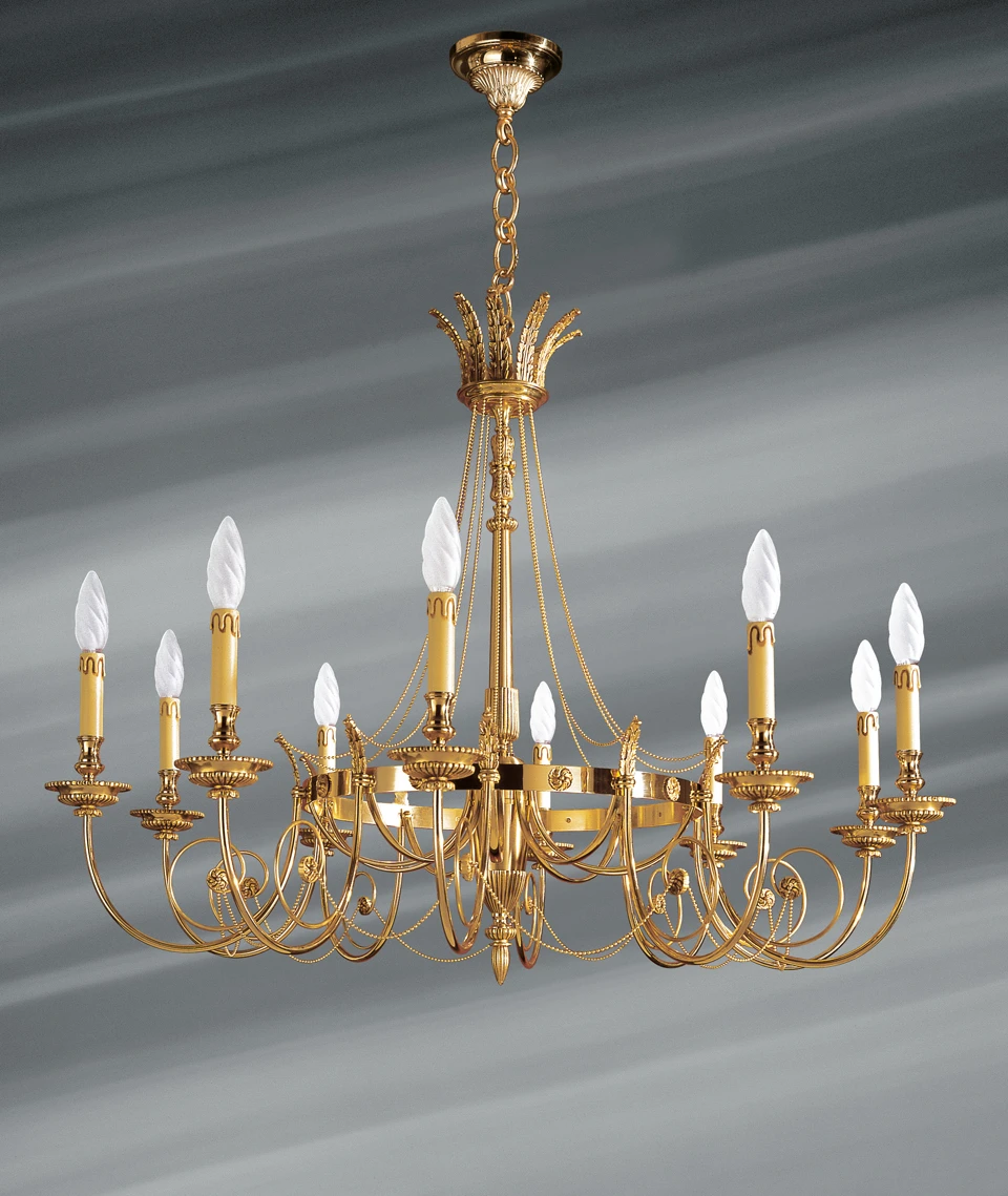 Grande pureté et légèreté pour ce sublime lustre de style Directoire en bronze massif et ses dix lumières portées par de très fins bras en demi-lune. Nous sentons dans ce lustre le souffle de liberté insufflé par la révolution. Un simple cerceau soutent les bras de ce lustre qui semble aussi léger que l’air. Des colliers descendent du motif ornant le haut du lustre. D’autres relient sans tension les bras recourbés qui surlignent chacun ceux portant lumières. Des bassins très travaillés en forme de doubles vasques sculptées, s’échappent les bobèches portant bougies. Ce lustre de grande dimension éclairera avec majesté une pièce de réception à usage privé ou professionnel d’une hauteur de plus de trois mètres trente. Cet ensemble d’une fraîcheur absolue est le fruit du travail exceptionnel des artisans d’art de la maison Lucien Gau. Cette grande maison de tradition française est le fournisseur des monuments historiques français et des plus grands hôtels et Palaces du monde entier.