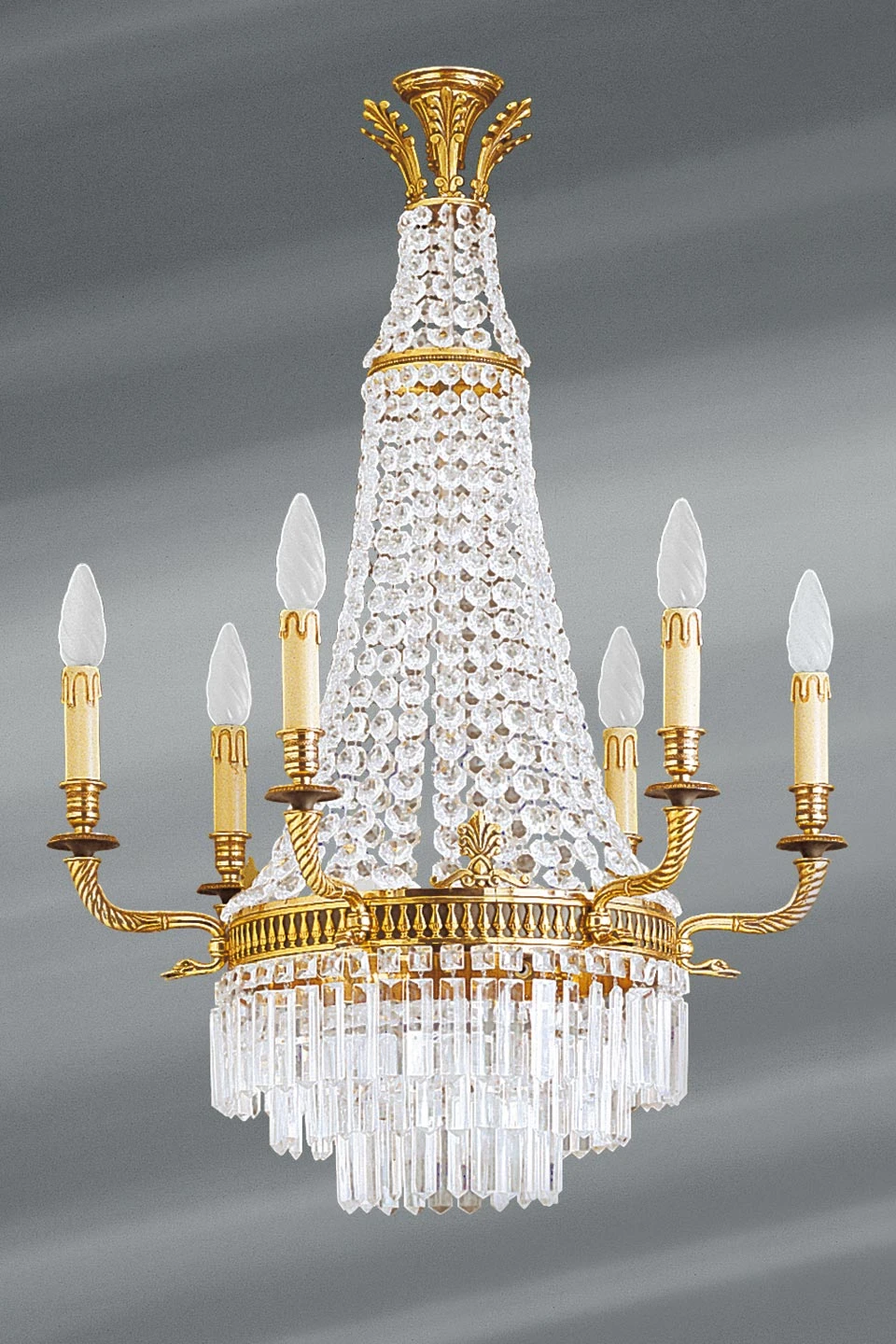 Ce magnifique lustre de style Louis XVI est décoré d’innombrables pampilles en cristal de bohème taillées en octogones et en prismes. La circonférence, décorée d’un motif ornemental Louis XVI, supporte six bras en torsade, supportant chacun une lumière, et se terminant par un motif en tête d’animal. Trois ampoules logées à l’intérieur de la partie centrale fournissent un complément de lumière, et provoque un merveilleux scintillement des cristaux de ce splendide luminaire. Le sommet est orné d’un motif en palmette. L’ensemble est réalisé en bronze massif, moulé au sable, travaillé et fini à la main par les artisans d’art dans les ateliers français du fabricant. Le bronze a reçu une patine vieil or, appliquée également à la main. Il existe une version coordonnée de ce lustre, de 92cm de hauteur, sous la référence 12030173.