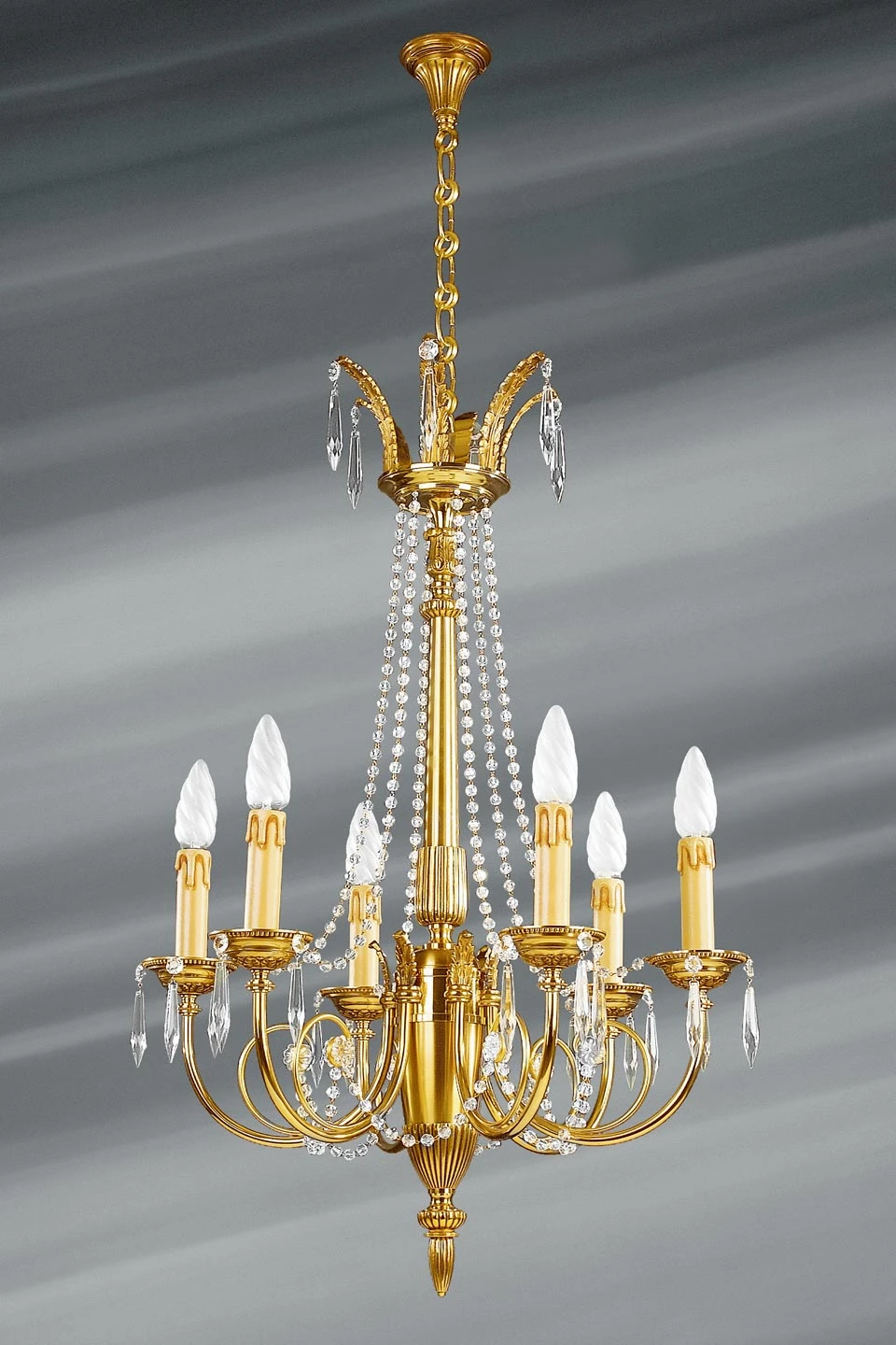 Ce magnifique lustre Louis XVI est décoré de nombreux éléments en cristal de bohème taillés en perle montées en collier. La partie centrale est formée d’un élément de forme ogivale et ornée de cannelures, surmontée d’un fin pilier également cannelé. S’appuient sur cet élément six bras dédoublés en volute, d’un dessin d’une saisissante élégance. Chaque bras est décoré d’un motif ornemental en feuille d’acanthe. Les bassins (coupelles situées à la base des bougeoirs) sont décorés d’un motif en perle d’une grande finesse. La partie supérieure de ce lustre est ornée de motifs en feuille d’acanthe. L’exécution, admirable, est entièrement effectuée à la main par les artisans d’art du fabricant. Le bronze, massif, est coulé au sable et travaillé et fini en employant les procédés les plus traditionnels. La patine, dorée, est appliquée à la main. Il existe aussi un modèle coordonné à 8 ou 10 lumières, sous la référence 12020181.
