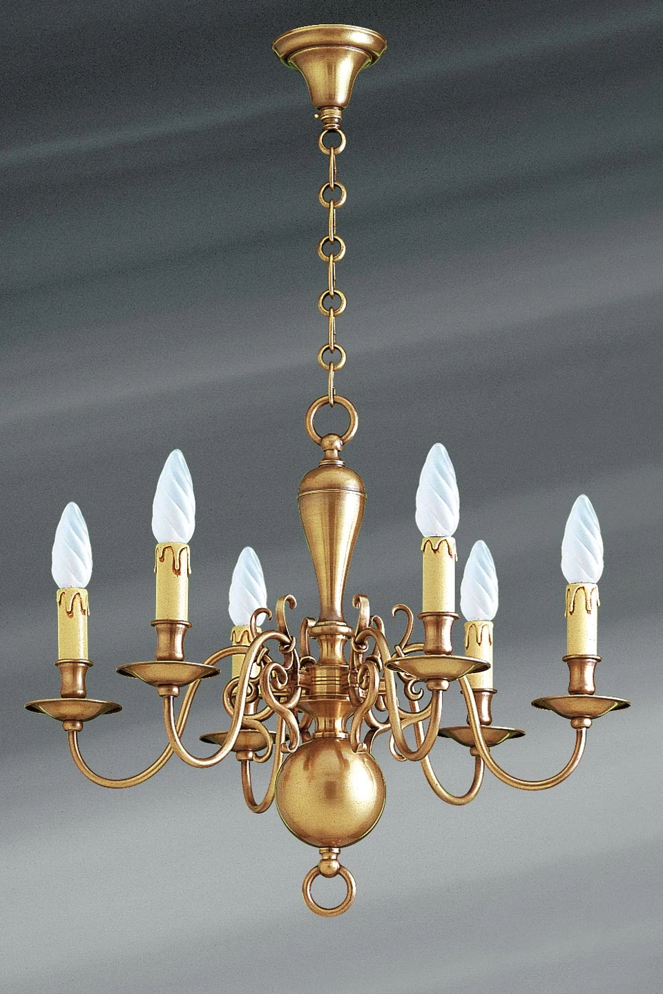 De très belle allure, ce lustre en laiton patiné est équipé de six lumières. Il est strictement conforme aux règles du style hollandais (période recouvrant la fin du XVIème siècle et le début du XVIIème). Chacun des six bras en simple volute est relié à la partie centrale par une clavette – un élément distinctif du style hollandais. La partie centrale comprend deux éléments de forme arrondie, chacune prolongée d’un anneau. L’anneau supérieur est relié à la chaîne de fixation. Ce lustre ne mesure que 65cm de hauteur sans chaîne, il peut donc être installé sous des plafonds d’une hauteur à partir de 2m60. On peut aussi choisir une installation basse (l’extrémité inférieure du lustre se trouvant alors à environ 1m60 du sol), par exemple au-dessus d’une table de salle à manger. La fabrication, artisanale, est réalisée intégralement en France. Le laiton est formé, travaillé, fini et patiné à la main. Ce lustre existe également en version à 5 et à 8 lumières, voir ci-dessous.