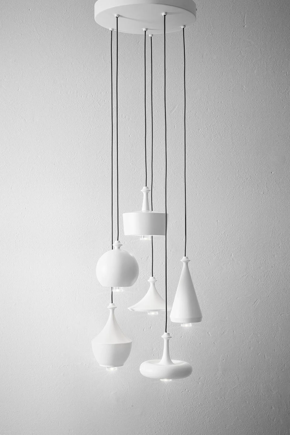 Une superbe combinaison de formes épurées pour cette grappe de suspensions Lustrini qui revisite des formes classiques pour un design contemporain. Elle est composée d’abat-jour en céramique blanc mat, matériau de prédilection de la marque, de différentes formes (sphère, sablier, ellipse, cône). Chacun des luminaires est suspendu sur un câble noir de 3m à un même support circulaire également blanc, qui permet de combiner jusqu’à 6 suspensions. Celles-ci son équipées d’un diffuseur qui produit une lumière plus large, et il est possible de commander des pitons discrets en laiton vieilli permettant de déporter la suspension, nous consulter pour cela. La maison italienne Aldo Bernardi s’inspire de méthodes de fabrication traditionnelles de la région d’Aloso et développe une collection contemporaine des plus élégantes.
