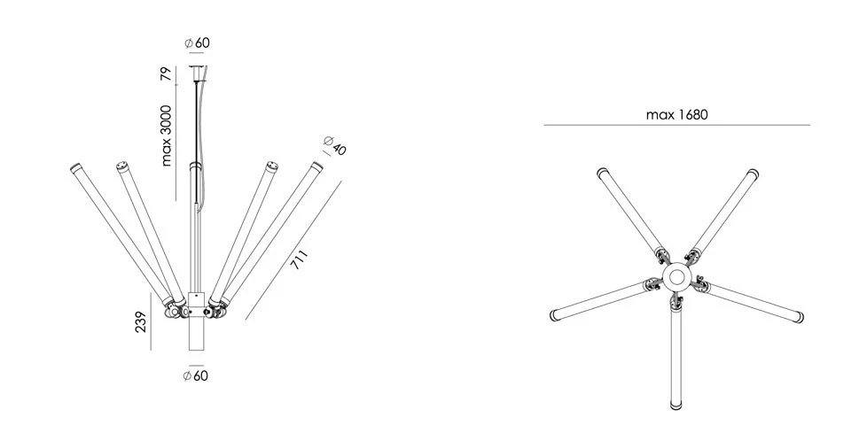 Dimensions: maximum 168cm de diamètre maximum, tubes de 70cm de longueur, 4cm de diamètre, support central de 6cm de diamètre et 24cm de hauteur, support de plafond de 6cm de diamètre. 300cm de hauteur totale maximale.