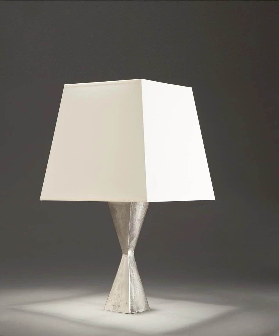 Dans le style toujours impeccable de la maison Objet Insolite, la lampe Pablo offre simplicité et force avec son superbe pied en bronze en forme de sablier étroit. Le bronze est moulé selon un processus d’inspiration industrielle qui produit cette texture particulière irrégulière qui fait de chaque modèle un luminaire unique. Ici nous avons la finition nickel obtenue en recouvrant le pied d’un fine couche régulière de nickel, préféré à l’argent pour sa résistance à l’oxydation, le tout après une opération de polissage du bronze. La résultat est une couleur très proche de l’argent. Le pied est surmonté d’un ample abat-jour de forme pyramidale en taffetas blanc cassé, très harmonieux avec l’argenté du pied. Objet Insolite est une maison française qui crée des luminaires au sein de ses ateliers normands depuis 1981, et qui bénéficie du label Entreprise du Patrimoine Vivant, distinction accordée par l’état qui reconnait les entreprises françaises à la production artisanale et industrielle d’excellence.