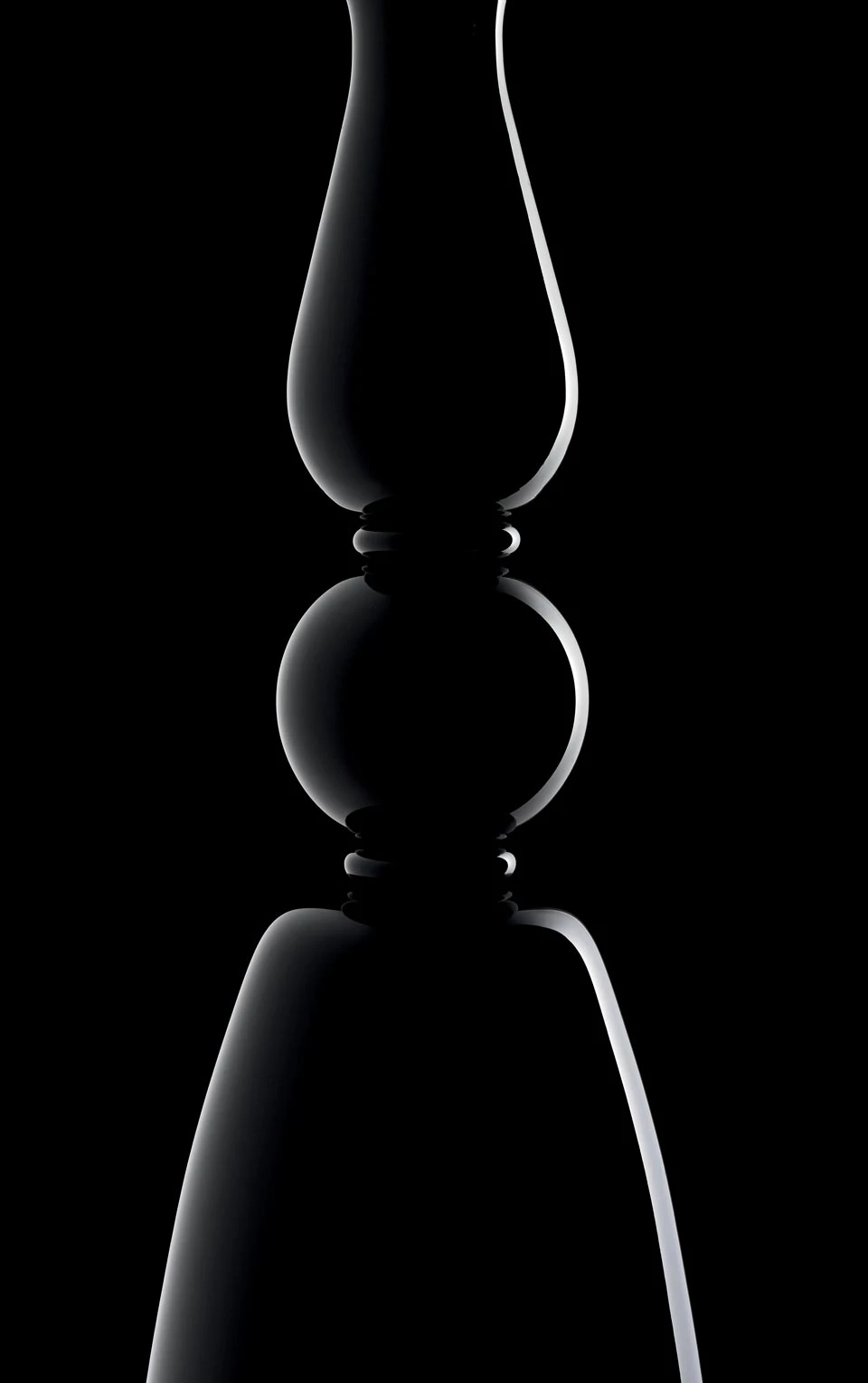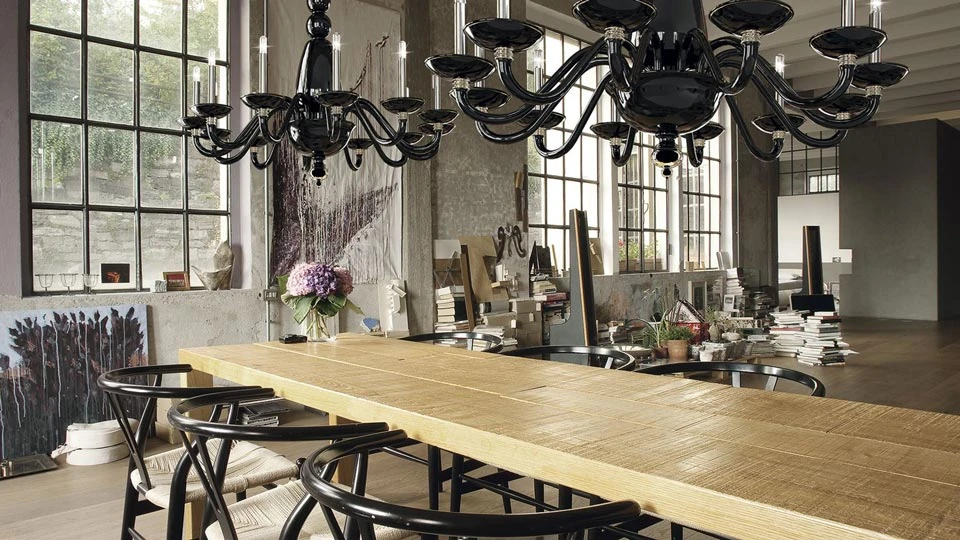 Symétrie et élégance sont les maîtres mots de la collection Palladiano dont est issu ce superbe chandelier 18 lumières au design vénitien classique revisité avec un œil contemporain, avec son magnifique cristal de Venise noir opaque, ses fourreaux chrome poli ou encore son corps aux courbes harmonieuses. Le lustre est doté de 18 bras en col de cygne qui jaillissent de l’enfilage et du vase, créant deux niveaux, surmontés de bassin en coupelle, de fourreaux droit chrome poli qui portent les lumières du chandelier. Entièrement réalisé en verre noir opaque qui lui donne presque l’air du métal, le luminaire impressionne par son design qui évoquant des traits presque architecturaux, avec son corps généreux. Le luminaire est un design de la maison Barovier & Toso, issue d’une longue lignée de maîtres verriers qui remonte au 14ème siècle, perpétue la tradition et les savoir-faire familiaux ainsi que la place maîtresse de la maison, tout en ayant introduit une dimension moderniste et une esthétique innovante dans la discipline du travail du verre de Murano.