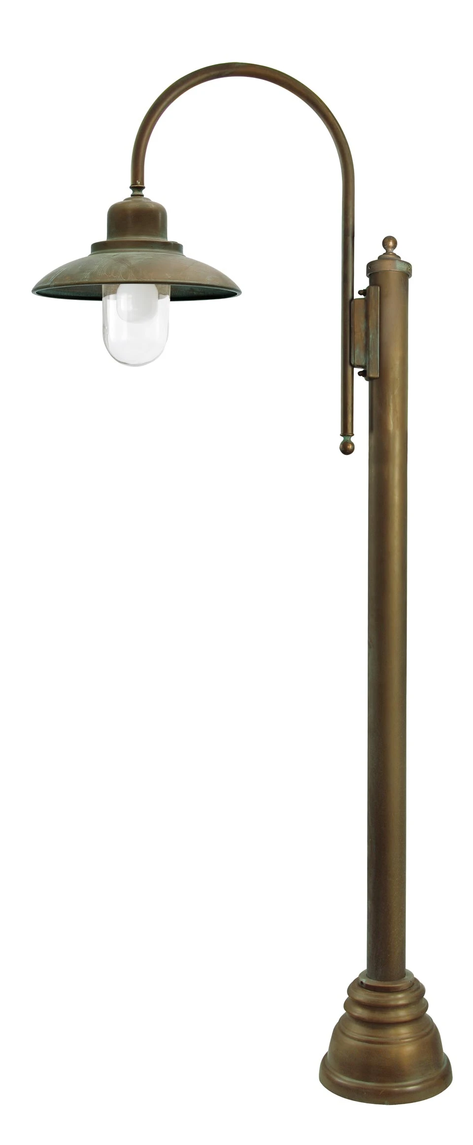 Beau lampadaire d’extérieur de la gamme Campagne, issu de la série Patio. Entièrement réalisé en laiton finition vieillie, parcouru de touches de vert-de-gris qui donne une patine authentique au modèle, il est constitué d’un socle circulaire, d’une pied droit prolongé d’un bras en U au bout duquel est fixé un abat-jour en cloche évasée, qui accueille une protection en verre transparent pour protéger l’ampoule. C’est un modèle pourvu de la protection IP44, et l’usage du laiton massif par la maison italienne Moretti en fait un modèle extrêmement résistant aux conditions d’extérieur.