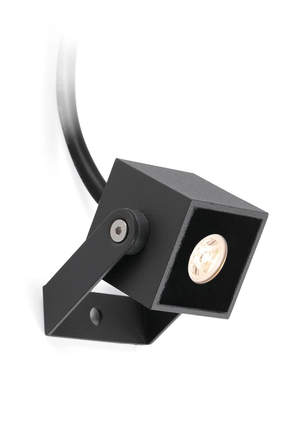 Ce petit spot est destiné à être fixé en extérieur grâce à sa protection IP65 qui le rend résistant aux intempéries. Il est fait d’une jolie forme cubique en aluminium gris foncé dans lequel est encastré un module LED derrière un diffuseur rond en verre et l’angle de diffusion est de 30°. Le boitier du spot est fixé sur un U à angles droits qui permet de le faire pivoter et ainsi orienter la lumière de haut en bas. Le driver n’est pas inclus dans le luminaire, il doit être acheter séparément. Il peut être fixé sur un pique, disponible dans les options de commande au bas de cette page.