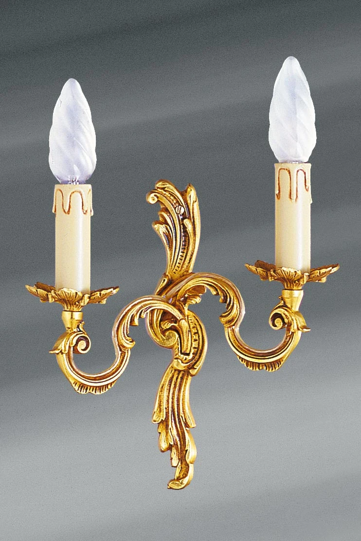 Ravissante, cette petite applique murale à deux bougeoirs en bronze Louis XV est constituée d’un support décoré d’un motif en feuilles et en perles. Il soutient deux branches recourbées délicatement sculptées, portant bougeoir à leur extrémité et décorées de façon assortie. Les bassins, coupelles placées à la base des bougeoirs, sont sculptés en feuilles évasées. La réalisation, d’une qualité exemplaire, est effectuée selon les méthodes les plus traditionnelles, en France, dans les ateliers de Lucien Gau. Il existe dans la même collection plusieurs appliques murales Louis XV, à trois lumières (références 12020228, 12020248 et 12020254), à deux lumières (références 12020230, 12020247 et 12020255), à une lumière (12020259, 12020281) ainsi qu’un ravissant modèle à deux lumières avec miroir ovale (12020278). L’applique à une bougeoir référence 12020259 est exactement assortie.