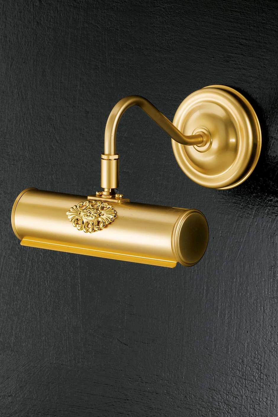 Cette très élégante applique de petite taille pour éclairage de tableau est constituée d’un corps cylindrique en métal doré. L’ouverture par laquelle passe la lumière est soulignée par un très fin rebord, apportant une touche supplémentaire de raffinement. Les extrémités sont serties. Le bras, également en métal doré mat, prend une forme légèrement courbée très sobre. Le support mural est de forme ronde, à rebord aplati. La hauteur hors tout de cette applique n’est que de 15cm – elle peut donc être installée dans des cas où la place disponible entre le haut du tableau et le plafond est limitée.