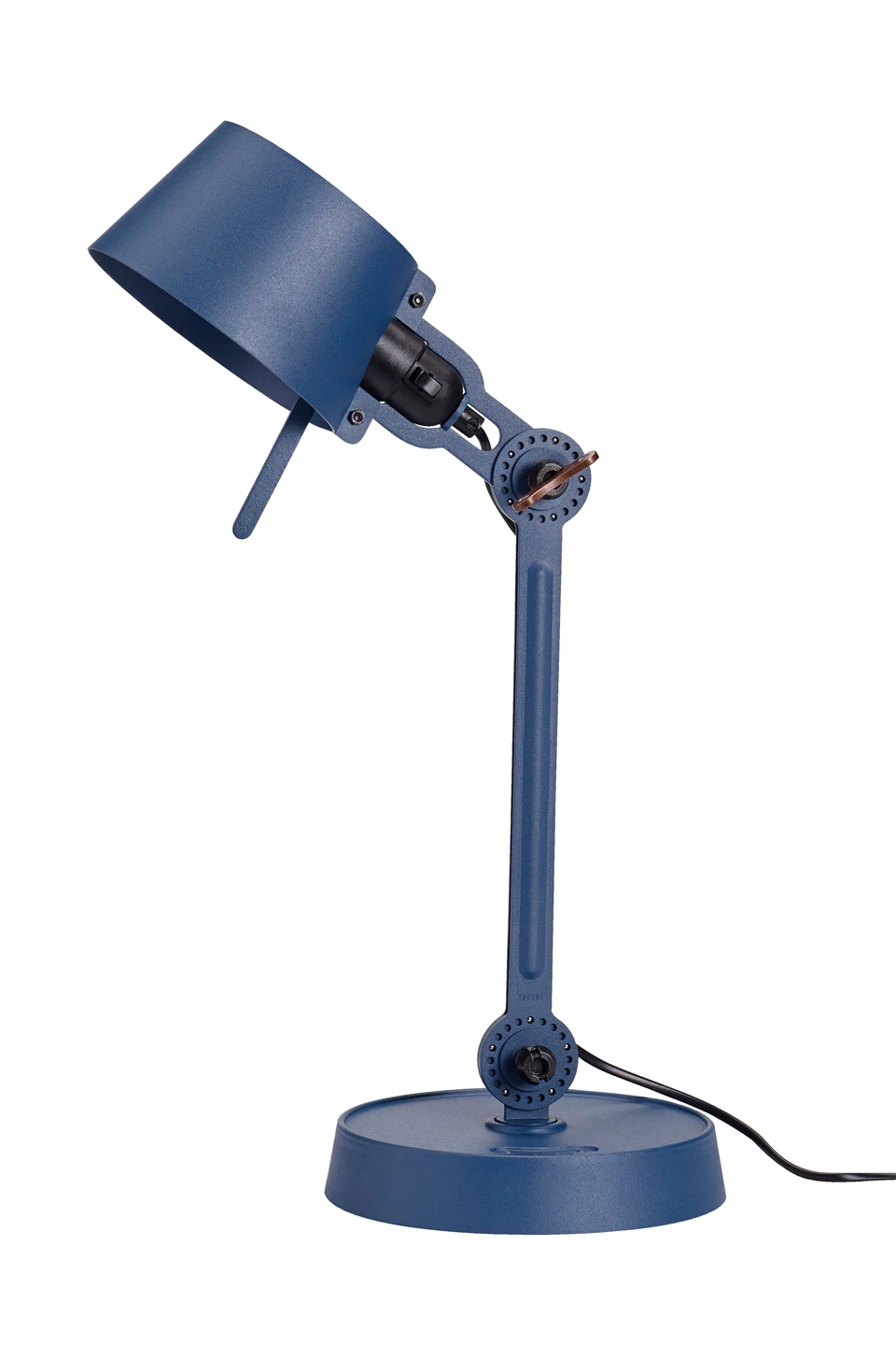 Le petit modèle de la lampe de bureau Bolt Desk en métal bleu – appelé orage par son créateur – garde l’aspect industriel de la gamme, avec un bras et deux rotules crantées. Un très bel outil en forme de papillon est fourni pour serrer les rotules. La finition du métal bleu est mate et légèrement grainée pour accentuer l’aspect massif et industriel de la lampe. Elle est composée d’un seul bras plus court que celui de ses consoeurs. Il est relié au réflecteur et au socle par des rotules, qui permettent un réglage précis et d’un réflecteur orientable à l’aide d’une poignée sur le côté. Le socle circulaire en acier massif est très stable. La lampe est livrée avec un très bel outil papillon siglé avec la marque TONONE et chaque lampe est numérotée. Bolt est une collection complète de 22 lampes dessinées par le designer néerlandais Anton de Groof. Les lampes TONONE se distinguent par leur design soigné, la densité de leurs éléments en acier et en aluminium et leurs très belles finitions. Elles sont entièrement fabriquées à la main au Pays Bas par des artisans hautement qualifiés. La petite lampe de bureau Bolt Desk se décline en 7 couleurs mates, par exemple en blanc écru sous la référence 17090127, en orange sous la référence 17090125, en kaki sous la référence 17090126 et en blanc pur sous la référence 17090128. Le même modèle existe également dans les 7 couleurs, avec un grand bras (voir le modèle 17090113, en noir). D’autres modèles proposent différentes combinaisons de bras, de modes de fixation et de tailles. L’outil papillon est cuivré par défaut, mais disponible également à la demande en noir, doré, et acier.
