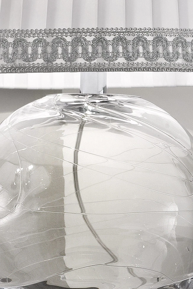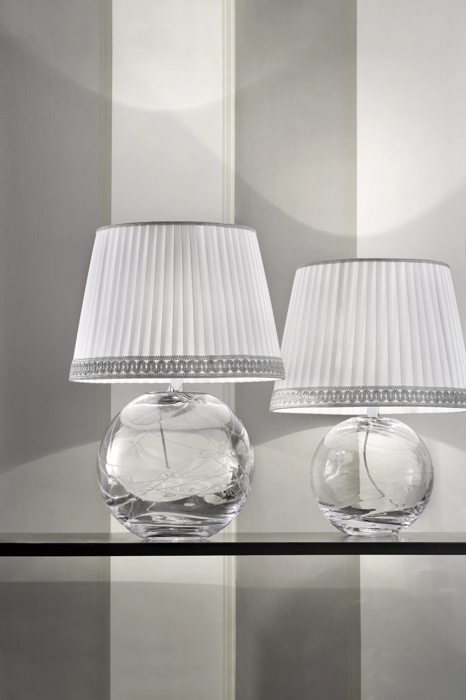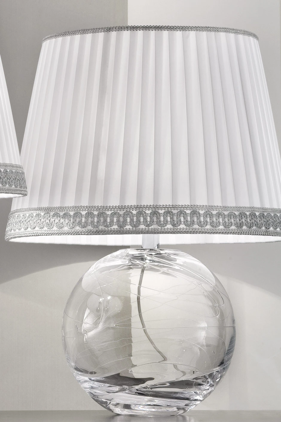 Petite Lampe Ronde En Verre Murano Transparent Abat-jour Taffetas De Soie Blanche Plissée