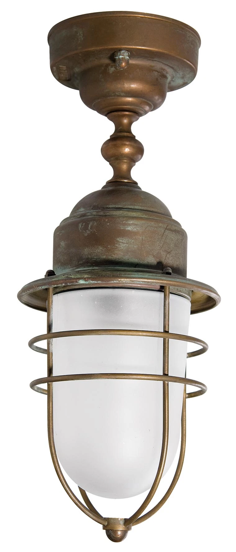 Une belle sobriété pour ce plafonnier d’extérieur en laiton vieilli style tempête de la gamme Marine. L’ampoule est protégée par un diffuseur en verre opale blanc avec entourage en laiton vieilli. Le support mural est en laiton également et de forme circulaire. Discrète, elle peut également être installée à l’intérieur de la maison à la campagne ou au bord de la mer. Ce modèle est conforme à la norme de protection IP44 et ne craint pas la corrosion due au sel. La fabrication en laiton massif d’excellente qualité est effectuée dans les ateliers de Moretti Luce, en Italie. Existe aussi avec tige droite réf. 15090404 et en applique réf.15090402.