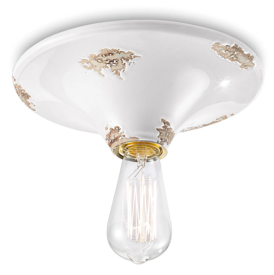 Ce plafonnier Vintage au large socle rond en céramique blanche est le complément idéal d’une déco au style industriel ou rétro. La céramique est écaillée par endroit pour un aspect vieilli. Cette technique est parfaitement maitrisée par les céramistes de Ferroluce, maison italienne qui œuvre depuis 1982. Il est équipé une ampoule LED décorative imitant le filament des anciennes ampoules à incandescence. Ce plafonnier existe en 7 autres coloris, turquoise référence 18020001, rose référence 18020003, jaune référence 18020004, noir référence 18020005, orange référence 18020006, framboise référence 18020007 et aqua référence 18020008.