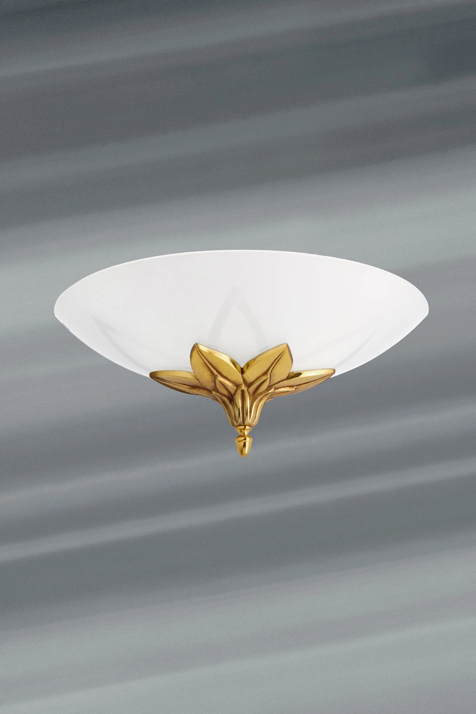 Laissez-vous séduire par la série Ramsès au style romantique Art Nouveau, à la fois simple et élégante, vous avez ici l’applique en verre opale et laiton. Le modèle est doté d’un diffuseur en demi-coupole réalisé en verre opale, agrémenté d’une jolie fleur dorée en laiton, dont le dessin est aussi reproduit en transparence sur la surface du verre. La coupole permet de diffuser une lumière en halo, chaleureuse et douce, et la fleur dorée ajoute une touche indéniablement chic au modèle. Ce luminaire a été dessiné par Donald Cardwell, décorateur, costumier et metteur en scène du 20ème siècle.
