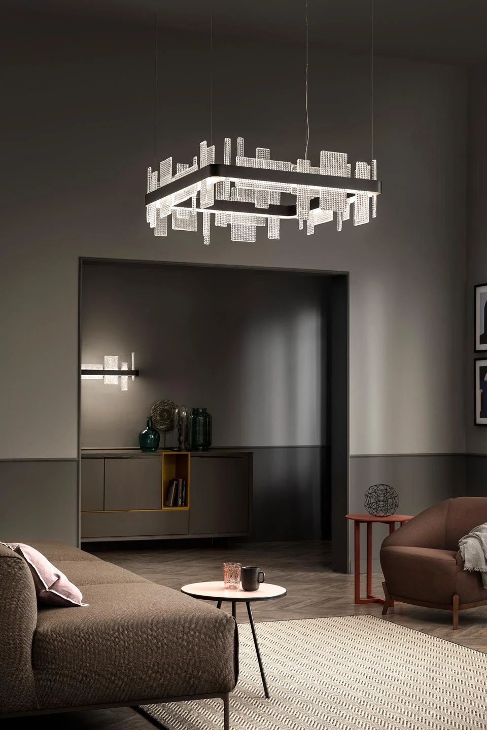 Magnifique suspension carrée 80cm issue de la collection contemporaine Ribbon, qui évoque la ligne géométrique et épurée dessinée par l’horizon urbain, avec une association de verre transparent gaufré en plaques de verre, d’un cadre carré en ruban de métal peint en noir mat et éclairage haut et bas garanti par des modules LED intégrés. La suspension est composée d’un carré de métal noir doté d’une série de diffuseurs placées de manières asymétriques, de différents formats rectangulaires. Le verre est moulé de manière à produire un motif gaufré et rendre cette texture givrée au matériau, et le modèle est équipé de 2 modules LED distinct qui produisent des intensités différentes, l’un dirige la lumière vers le plafond et l’autre vers le sol. La maison italienne Masiero réalise un parfait mariage entre l’esthétique vénitienne classique et la créativité permise par les innovations technologiques, pour une collection élégante et pléthorique.