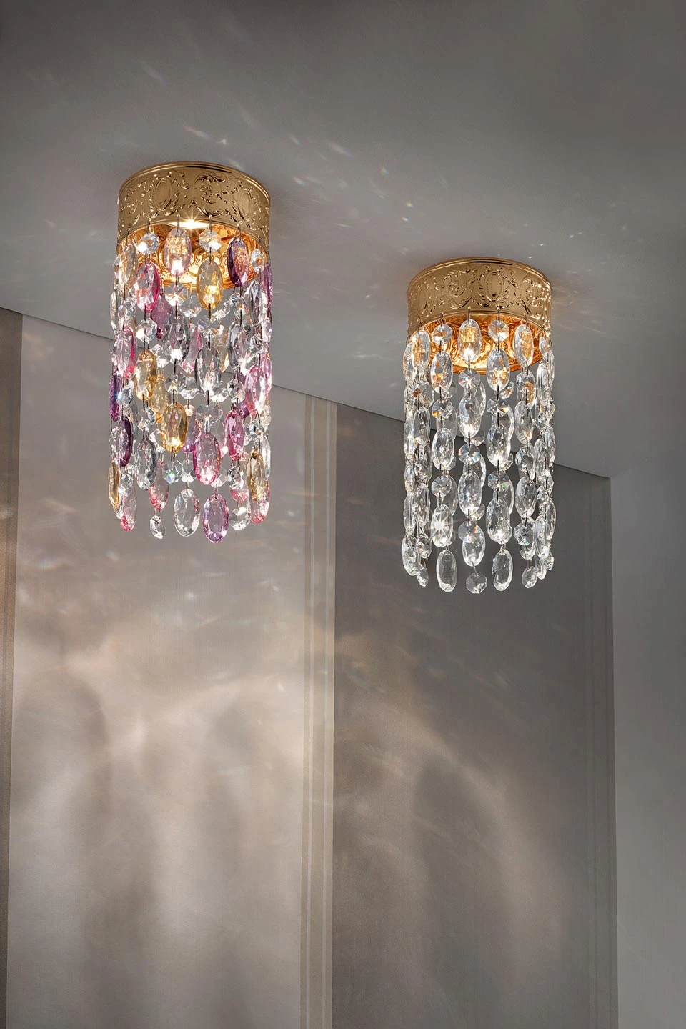 Un spot original dans un style classique revisité, il est encastré dans le plafond, dans un anneau de métal finition doré découpé de jolis détails floraux, sur lequel sont suspendu des guirlandes de pampilles. Celle-ci sont de gros cristaux taillé de différentes couleurs, transparent, ambré, fumé, violet. La lumière produite est chaleureuse et c’est un modèle qui apporte de la couleur à votre intérieur.