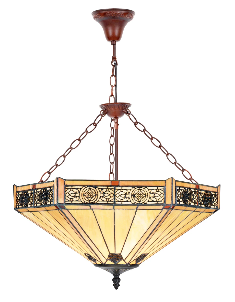 Cette suspension s’inscrit dans le pur style Tiffany, avec une inspiration Art Déco identifiable à son motif géométrique. La suspension est dotée d’un abat-jour hexagonal en cône inversé, formé d’une multitude de pièces de verre assemblées à la main grâce à de fines jointures métalliques. Le bandeau inférieur est comme estampée de délicats motifs arrondis formés par les joints de métal, et la partie supérieur est fait de pièces pyramidales allongées. La couleur jaune pâle du verre confère cette chaleur caractéristique de ce style à la lumière diffusée. L’abat-jour est suspendu sur une tige métallique équipée d’une coupelle intermédiaire qui permet la fixation de chaine qui équilibrent l’abat-jour, et d’une cloche de plafond en cloche, couleur acajou. Le fabricant espagnol Artistar explore le style Tiffany avec cette collection qui démontre l’intemporalité de cette esthétique du 19ème inspirée de l’Art Nouveau.