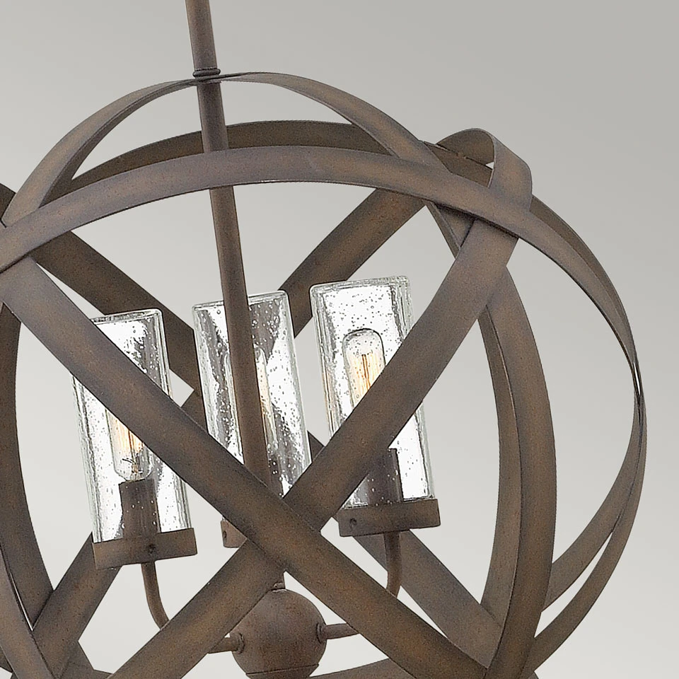Superbe suspension d’extérieur ronde Carson 3 lumières, un audacieux entremêlement de rubans métalliques en forme de sphère avec métal rouillé, verre grainé et protection IP44. Carson se présente sous la forme d’une sphère de rubans métalliques en métal, à l’intérieur de laquelle se trouvent les trois lumières chacune dans un diffuseur cylindrique en verre grainé, montés sur bras à 90° autour d’une boule de métal. Le tout est suspendu par une tige à un support de plafond rond légèrement bombé. La protection IP44 garanti une résistance aux conditions extérieurs dans la durée, tant de la pluie, du froid que du sel ou du vent. Impeccable collection d’extérieur de la maison britannique Elstead Lighting, connue depuis le XVIIème siècle comme les forges Elstead, aujourd’hui alliant la perpétuation des techniques artisanales à une véritable modernité dans le design et la réalisation.