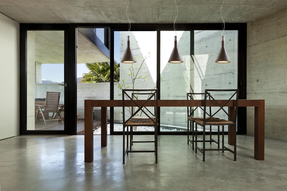 Cette très moderne et prestigieuse suspension en béton ciré, baptisée Funnel, prend la forme d’un cône, surmonté d’une petite partie cylindrique dont une extrémité est réalisée en métal nickelé mat. Cette suspension est tenue par un câble métallique à un boîtier de plafond en portion de sphère, en métal patiné assorti. Bien que réalisée en béton ciré, cette suspension surprend par son faible poids: elle ne pèse que 4.5kg, grâce à l’emploi d’un béton fibré spécial. L’éclairage est principalement dirigé vers le bas, on peut obtenir un effet visuellement spectaculaire en associant deux ou trois suspensions alignées au-dessus d’une table de salle à manger ou d’un plan de travail. Les ateliers Aldo Bernardi ont développé les techniques permettant d’appliquer ce béton fibré au domaine du luminaire.