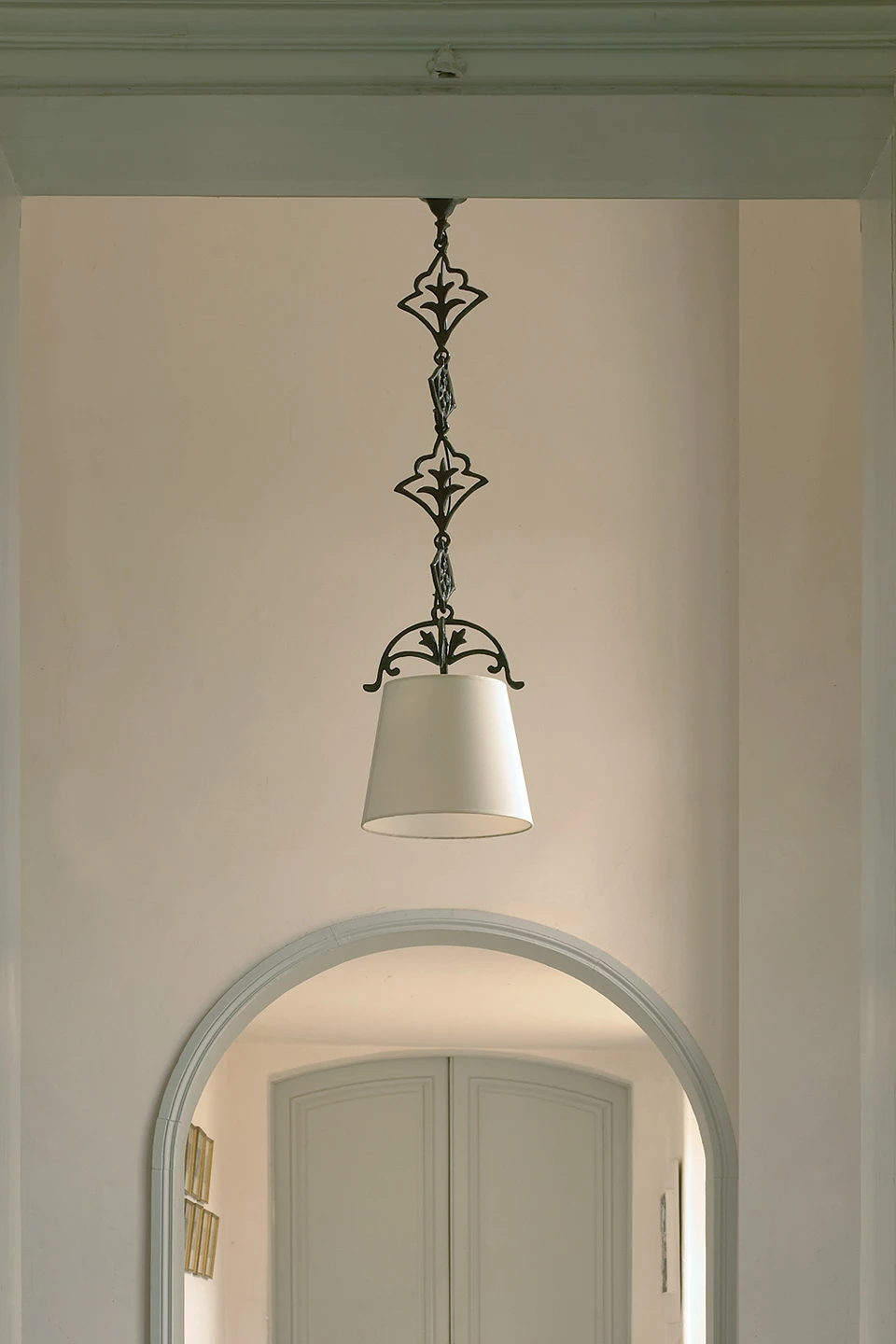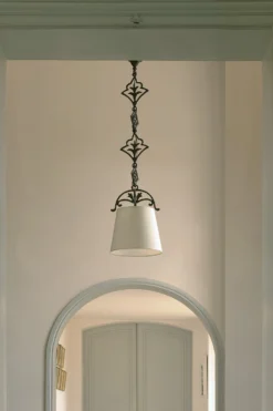 L’originalité de la suspension Verone en bronze patiné réside dans les maillons de chaine, qui, à la place de simples anneaux, sont des pièces de bronze finement dessinés, avec deux décors différents. De nombreuses volutes forment l’attache de l’abat-jour conique blanc. Le bronzier Augustin Granet utilise des techniques de moulages issues de l’industrie qui apporte irrégularités et force à la matière. Ce savoir-faire associé à un design toujours élégant et à la noblesse du bronze nous offrent une collection de luminaires raffinés, destinés aux plus belles demeures. Par défaut, ce luminaire est livré avec l’abat-jour proposé sur cette image mais le tissu peut être choisi dans le nuancier visible en photo complémentaire sur cette page, choix à préciser dans les informations spéciales de votre formulaire de commande. Cette suspension existe aussi en dorée sous la référence 17090344.