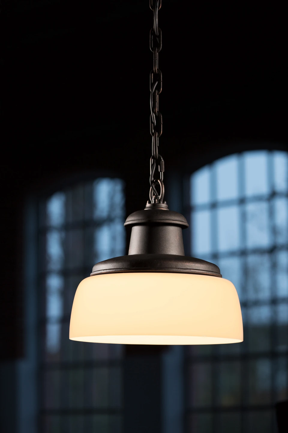 Une belle suspension en fer forgé et verre opale dont les formes arrondies se réfèrent au design industriel du début du 20ème siècle. La beauté de ce modèle vient du diffuseur en verre opale blanc qui contraste avec la masse de fer forgé sombre, finition cuivre patiné. Le cône de plafond est cylindrique et en fer forgé assorti. Cette suspension est livrée en version standard avec une chaîne de 1m, celle-ci peut être ajustée à vos mesures, nous consulter. Ce luminaire est fabriqué à la main dans les ateliers et forges de la société Robers en Allemagne. Une applique d’extérieur assortie est visible sous la référence 19010008.