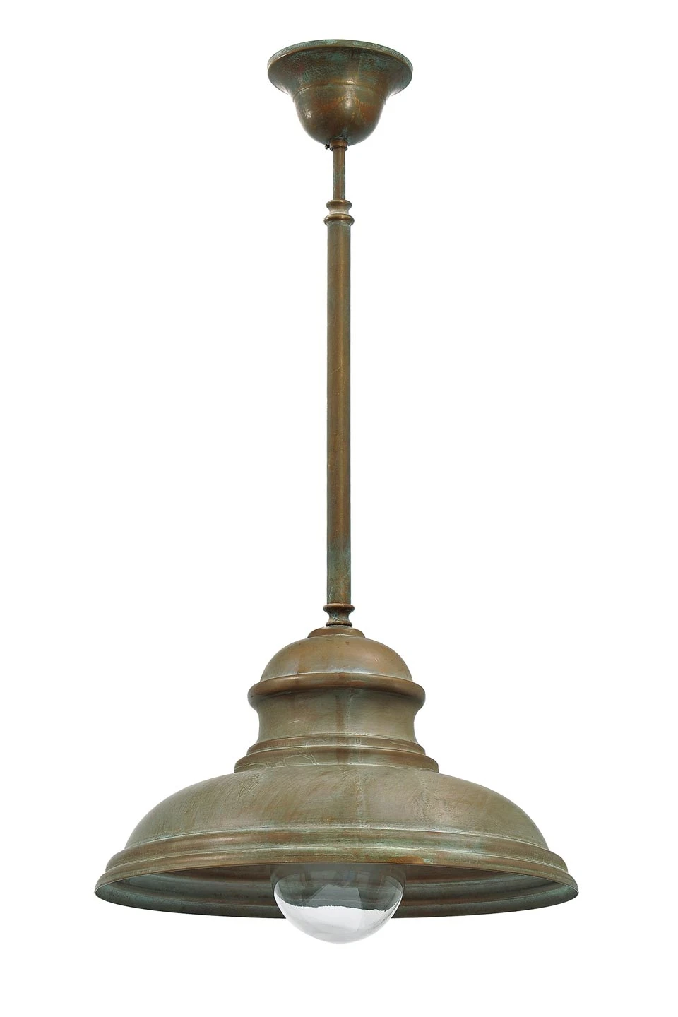 Cette suspension sur tige pour l’extérieur en laiton vieilli est constituée d’une coupole en métal tourné faisant réflecteur, placée au bout d’un tube droit relié à un support de plafond rond. Parmi les options de commande ci-dessous, on peut également choisir cette suspension en plafonnier: le tube est alors raccourci à sa plus simple expressions. Le laiton est recouvert d’une patine, aux discrets reflets vert-de-gris. Un globe en verre dépoli protège l’ampoule et complète l’étanchéité IP44 à laquelle satisfait ce luminaire. Attention, le fabricant précise que la patine employée n’est pas prévue pour une exposition directe aux intempéries marines. Il existe dans la même série une suspension sur chaîne 13060205 et une applique murale 13060203. Fabriqué en Italie, dans les ateliers de Moretti Luce.