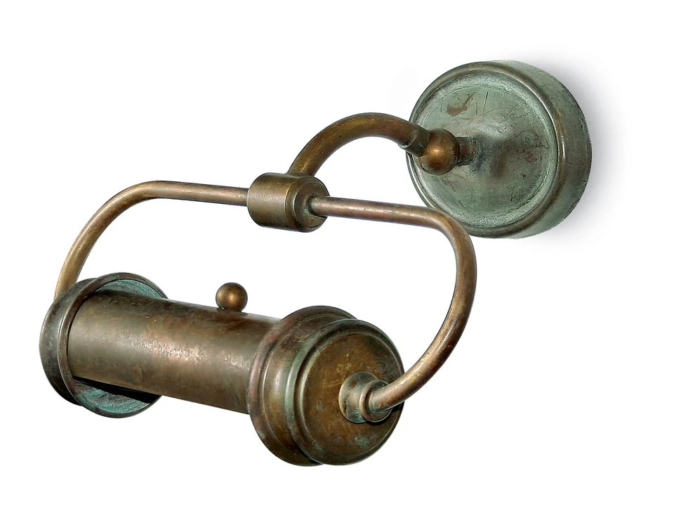 L’applique pour tableau Taverna est parée d’une patine vintage old school tant par sa finition laiton vieilli que par son esthétique tout droit sorti d’une ambiance de bibliothèque américaine du siècle passé, le modèle est entièrement réalisé en laiton moulé sous pression, il se compose d’un cylindre horizontal dans lequel se visse l’ampoule, fixé par un anneau allongé sur un bras court et relié à un support mural rond. Remarquez la superbe finition laiton vieilli, qui donne cette patine authentique à l’applique, parcourue de touches de vert-de-gris. La maison Moretti, particulièrement réputée pour la qualité du laiton massif moulé sous pression qu’elle travaille, livre une collection qui mêle d’élégants modèles d’intérieur et d’extérieur empruntant tant au style classique que campagne ou industriel.