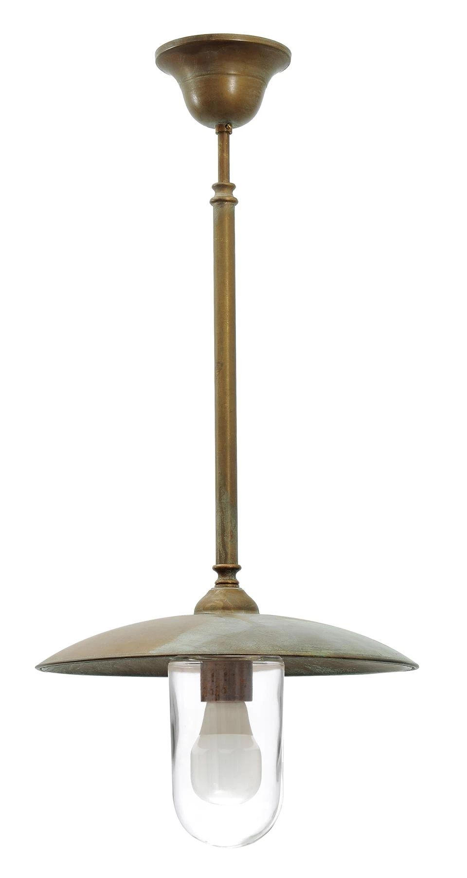 Une applique d’extérieur de la collection Trasimeno, issue de la gamme Campagne. Elle est composée d’un cône de plafond sur lequel est fixé une tige droite au bout de laquelle est attaché l’abat-jour circulaire en forme de plateau bombé, qui accueille un verre de protection transparent pour l’ ampoule. Le modèle est entièrement réalisé en laiton avec une finition vieillie qui lui donne une patine authentique, avec des touches de vert-de-gris. La maison italienne Moretti emploi du laiton massif d’excellente qualité, qui combiné à une protection IP44 produit des luminaires d’extérieur extrêmement résistants aux intempéries et à l’humidité, au froid ou au sel.