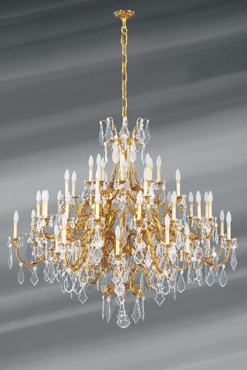 Exceptionnel, ce très grand lustre doré en cristal de bohème de style Louis XV est réalisé en bronze massif. Il est équipé de 56 lumières. Il est également disponible en versions à 30 et 80 lumières, voir ci-dessous. Ce lustre a reçu une patine vieil or appliquée à la main. Il est décoré de nombreux cristaux de bohème taillés en plaquette, de forme feuille, montés sous rosace. Une boule de cristal taillée en facette orne la partie inférieure de ce très bel ensemble. De très grandes dimensions avec 200cm de hauteur (hors chaîne), ce lustre est réservé aux plus grandes demeures. Il est également disponible en version à 30 lumières (hauteur 145cm sans chaîne) et à 80 lumières (hauteur de 320cm). Les modèles à 30 et à 56 lumières peuvent être également commandés sans cristaux. Ces versions peuvent être choisies parmi les options de commande ci-dessous. Il existe également un modèle assorti, à 45 lumières, disponible sous la référence 12020151.