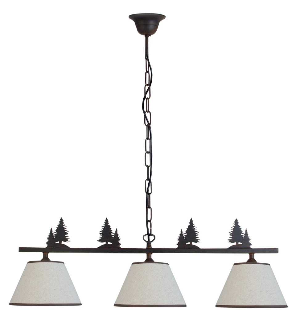 Une superbe suspension triple de la collection Montagne, qui porte bien son nom avec sa structure en métal patiné, une barre horizontale surmontée de quatre silhouettes de deux sapins chacune, suspendue par une chaine. Sur la barre horizontale sont fixés les trois abats-jours, ceux-ci sont en lin, liserés en haut et en bas de brun. C’est une suspension idéale pour éclairer une table à manger ou une cuisine, au coin du feu d’un chalet montagnard typique. La marque Ryckaert offre une production artisanale et authentique depuis 1947, à partir de matériaux tels que le métal ou le bois, qui sont sculptés et patinés à la main, et nous livrent ainsi des produits uniques.